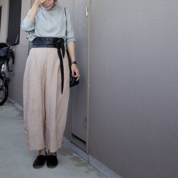 イージーケア加工がうれしい、ユニクロのレーヨンドレープハイネックブラウスは1,990円(税抜)。肌触りが柔らかで、ゆるっとした着こなしができるアイテム。明るめトーンのコーディネートは、小物はブラックで統一してメリハリをプラス。