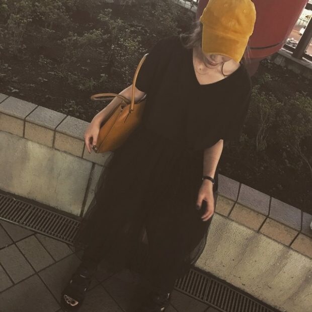 全身ブラックのコーデに差し色としてプラス。バッグの色とリンクさせてオシャレなバイカラ―コーデの完成。コーデにワンポイント欲しい時にも使えるアイテムなんです!