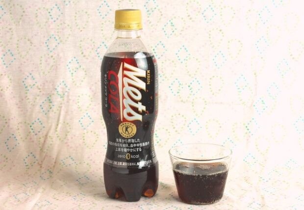 コーラでは初めて特定保健用食品の指定を受けたメッツ コーラ。食事から摂取した脂肪の吸収を抑えて排出を増加させる難消化性デキストリン(食物繊維)の働きにより、食後の中性脂肪の上昇を抑制するそう。1本飲んでも0kcalです。