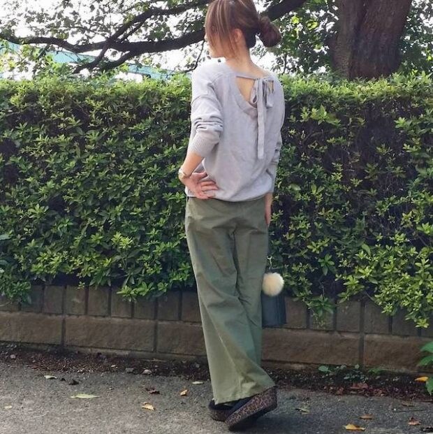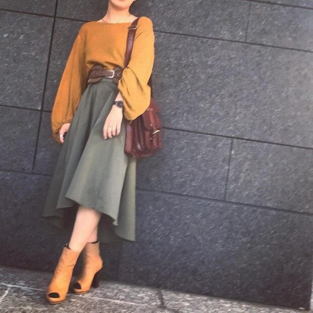 ぽわんとしたデザインがキュートなバルーンスリーブは今シーズンもまだまだ人気。マスタードカラー×カーキの組み合わせで秋らしさを感じさせるコーディネートに。小物はブラックではなくブラウン系でまとめることで、優しい印象のスタイリングになりますよ。