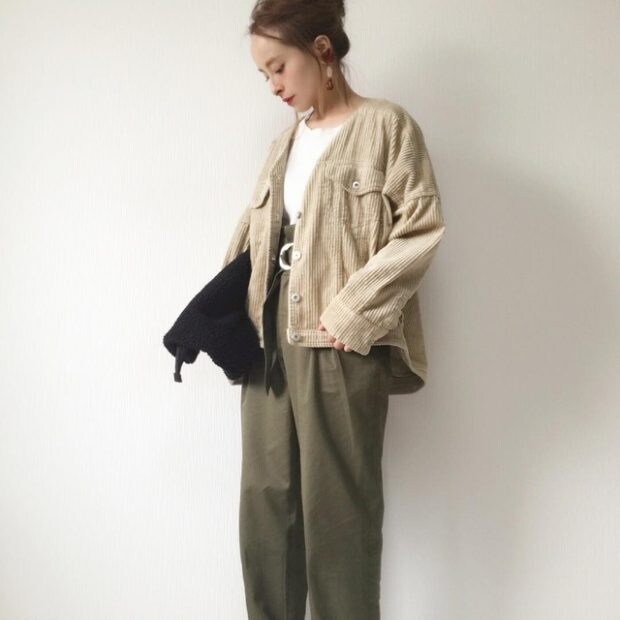 秋冬に活躍してくれるコーデュロイジャケット。ビックシルエットだから、彼のアイテムを借りている風コーデに♪ 襟がないデザインだから、スッキリ着られる優秀アイテムです。