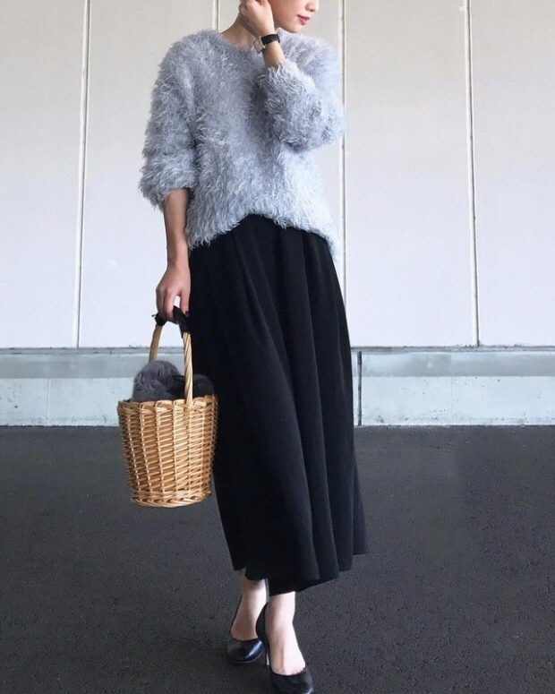 思わず触れたくなる質感のシャギーニットは、着るだけで女子力を上げてくれるアイテム。ふわもこ素材はちょっとキュートになりがちだけど、グレーのチョイスだと大人女子でも使いやすいですよ。コーデのカラーを統一するのも、かわいいだけのコーデにならないコツ!