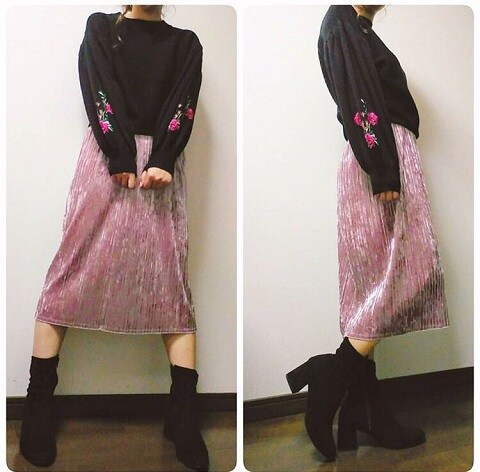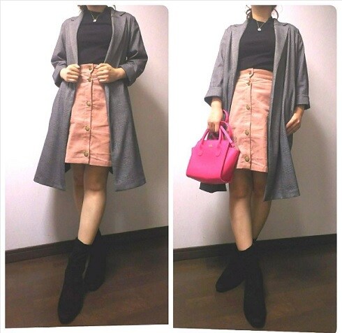 同じブーツを着まわしたコーデがこちら。ミニスカートでも、膝下のスカートでもバランスがとりやすいショートブーツ。要チェックですね!