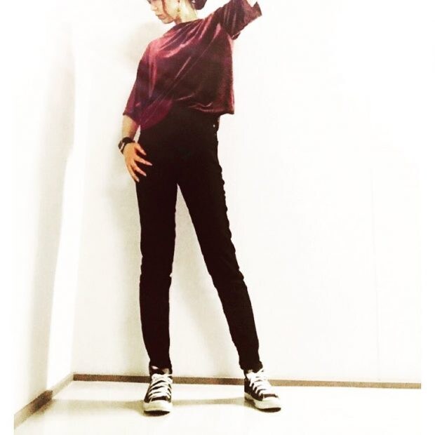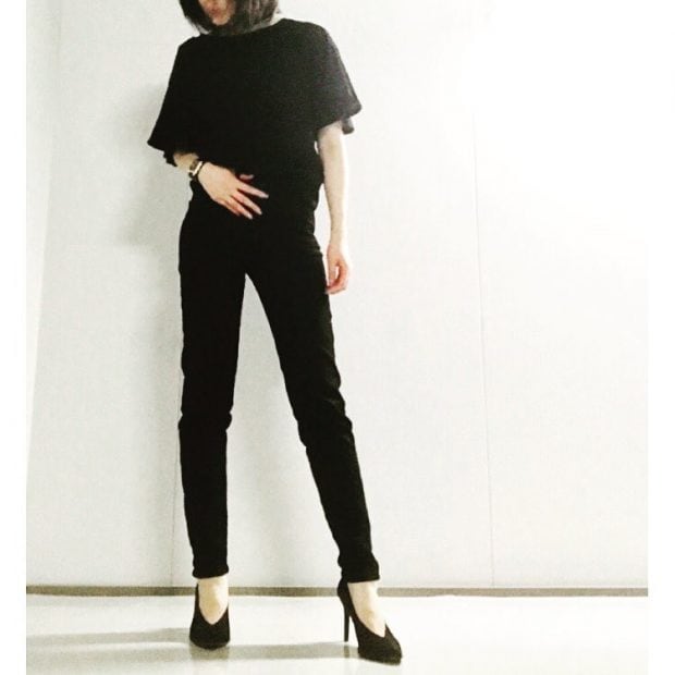 こちらはさらに黒一色! 楽ちんでも美しいシルエットは健在、という証明になるようなコーデではないでしょうか。