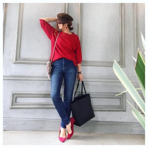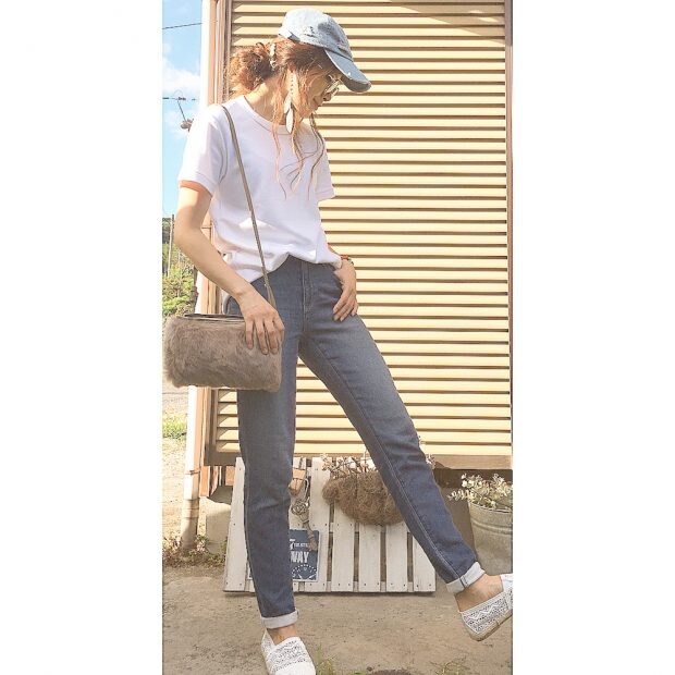 こちらは同じデニム素材のキャップ、ファー付きショルダーバッグと合わせています。ジーンズのシンプルさが際立つコーデですね!