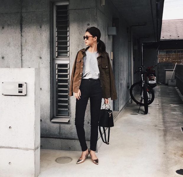 ブラックデニムと相性の良いゴールドを所々に取り入れることによって上品さをプラス! シックな色のジャケットを合わせることで秋らしいコーデになっています。