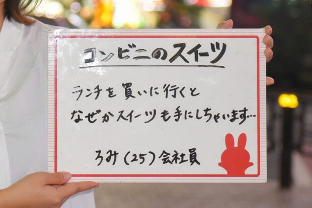 ろみちゃん:会社の近くのコンビニによくお昼を買いに行くんです。ご飯を手に取ってレジに向かうと……なーんか視線を感じるの。誰だろう……って周りを見渡すと、「私を買って」ってスイーツが棚からじっとこちらを見てるんです!
