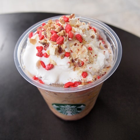 トッピングが目を引くこちらは、「アーモンド ミルク & グラノラ フラペチーノ®」。
