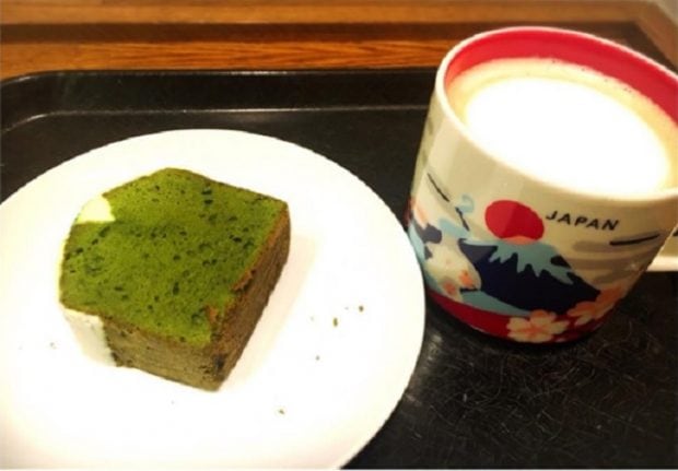 お店で、マイマグカップとして使うのもいいですね! 抹茶のケーキがマグカップのデザインとマッチしています。