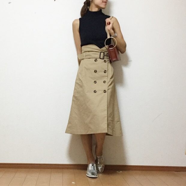 トレンチ風スカートはAラインシルエットで履けるから、美脚効果も抜群。シンプルなニットとの合わせで清楚なコーディネートが完成。寒い時期は長袖ニットやカーディガンと合わせてみて。このスカート、ウエストの位置を折り返しても穿ける2wayデザインなんですって。