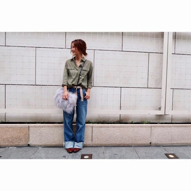 ラフさが魅力のロールアップデニム×カーキのシャツのボーイッシュコーデ♪ ふわもこのファーバッグを持って、スイートさもミックスさせたスタイリングがステキ!