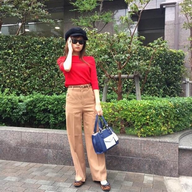 パキっとカラーの赤ニットを、ベージュのボトムスで優しく受け止めたコーデ。キャスケットやレオパード柄のパンプスを取り入れた遊び心溢れるスタイリングですね。