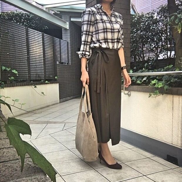カジュアルな印象になりがちなネルシャツですが、ラップスカートとヒールで大人見せも可能! 色のトーンも揃えることで、さらに高見えコーデになりますね。