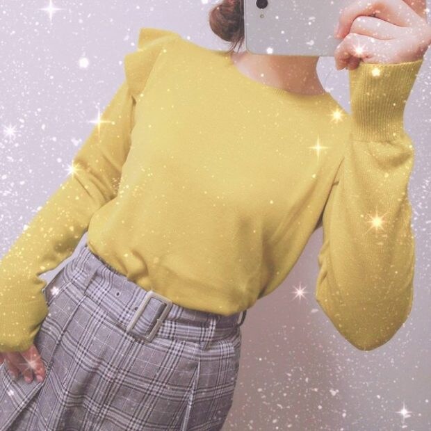 肩部分にフリルが付いていてキュートなショルダーフリルセーター 。トレンドのチェックボトムスと合わせて、ちょっとフェミニンなコーディネートに。