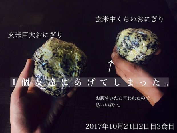 ある時はお人好しが発動して、「お腹が空いた〜」とうるさい友人に、貴重な玄米おにぎり分け与えてしまったり。