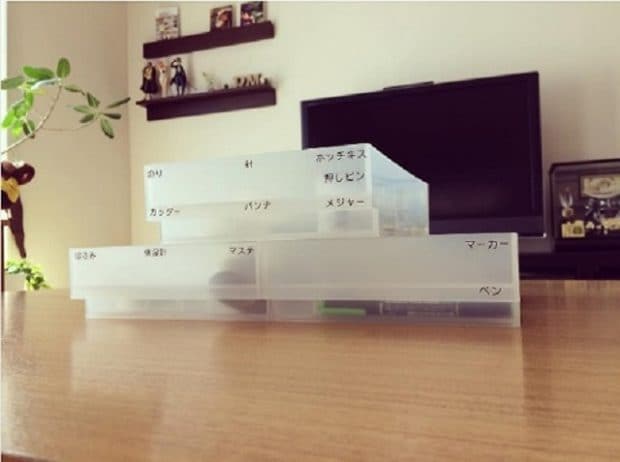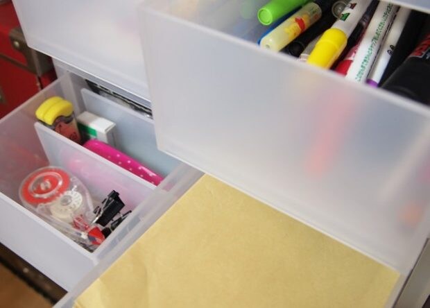 まずは、とにかく小分けにします。これまで「文房具」とざっくり分けていた引き出しも、「のり」「ホチキス」など小物ごと、あるいは使う人ごとに分けることでスッキリとします。