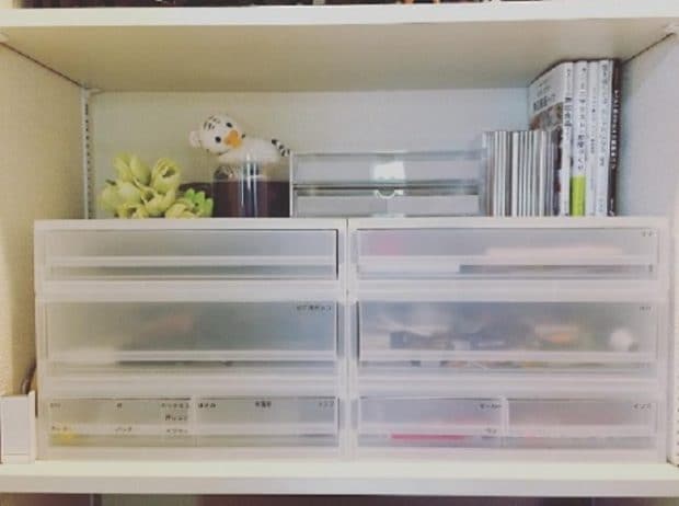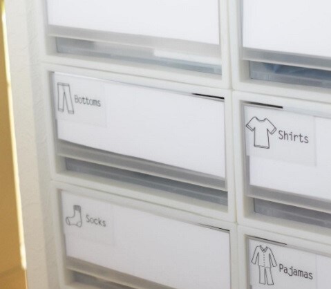 こちらは、洋服を「Tシャツ」「ジーンズ」「下着」「靴下」といったように分類しています。中身が見えるケースをあえて白い紙で隠すことで雑然とした感じがなくなり、美しく見えるそうです!