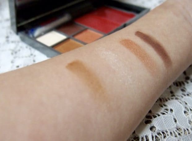 目元、頬、口元はこの4色パレットだけで済むので、ポーチがかさばりません。4色パレットを腕につけてみました。アイシャドウはシックなカラーなので、メイクにも季節感を取り入れられます。