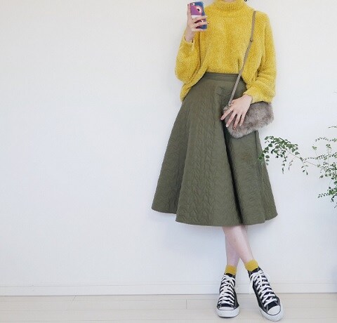合わせるアイテム次第で、女性らしくもカジュアルにも着こなすことができるキルトスカート。完売続出しているようなので、見つけた時はすかさずゲットして!
