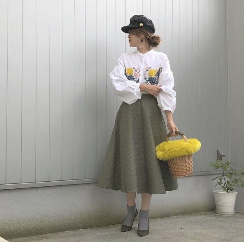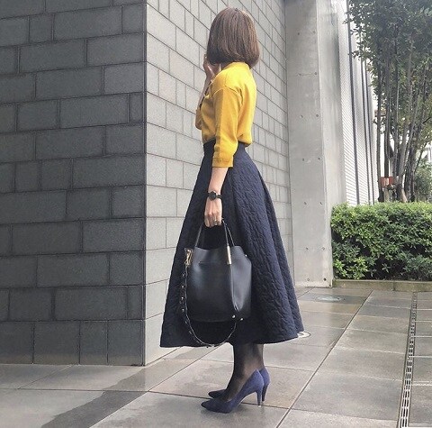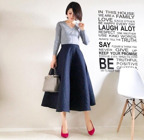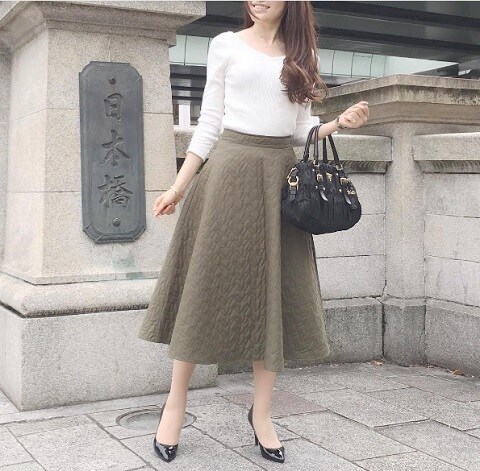 トレンドのミディ丈のスカートはパンプスと合わせることでレディ感がアップします。