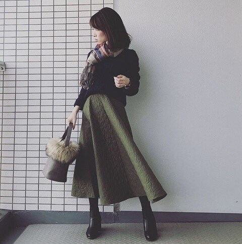 チェックのマフラーやファーのついたバッグで、季節をちょっと先取り! スカートは中綿入りなので温かく、ショートブーツと合わせれば、冬まで着られるのも魅力。