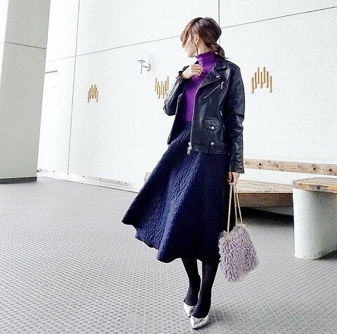パンプスと合わせたエレガントなコーデですが、アウターにレザージャケットを持ってくると、ほどよいレディ感に!