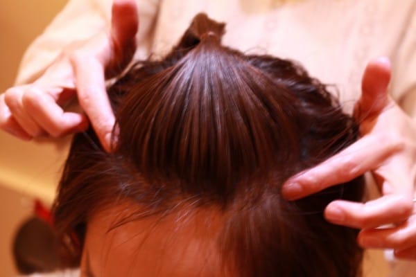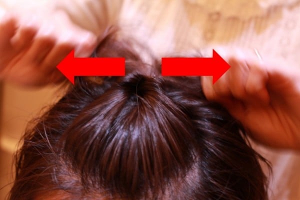 可愛く見せるポイントはここ! 平らになりすぎないように、結んだ髪を軽くほぐし、ボリュームを出します。
