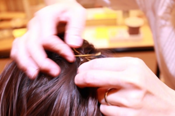 出来上がった前髪くるりんぱのゴムの結びあたりに、ヘアピンを交差するようにつけていきます。
