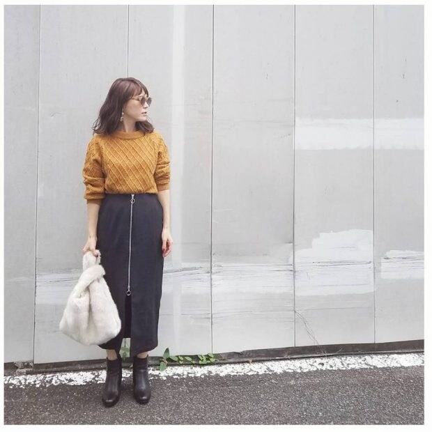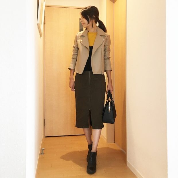 ロングなタイトスカートは短めのアウターと合わせて、Iラインを意識したスタイルがオススメ。フロントジップのラインがあることで縦長感が強調されて、スタイルが良く見えますよね!