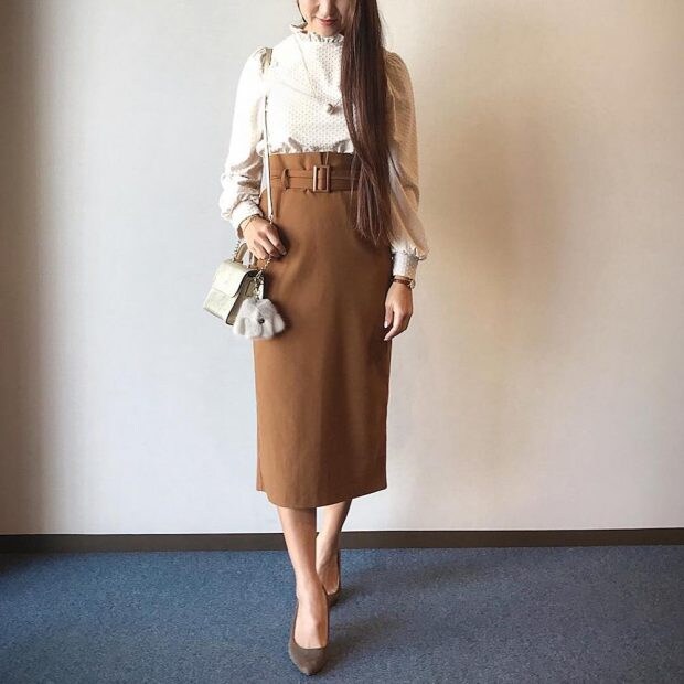 「ベルト付きハイウエストタイトスカート」のこちらのコーデは、ハイネックのブラウスにパンプスと合わせて、大人のカジュアルコーデを完成させています。その美しい立ち姿に大人の女性オーラを感じます……! 価格は1,990円(税抜)です。