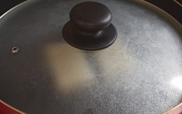 水大さじ1をフライパンに注ぎ、すぐ蓋をして更に約1分熱します。水が無くなってきたら、火を止めて約3分間放置して蒸らします。