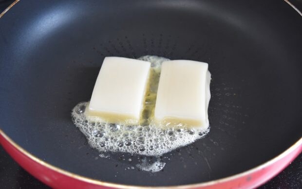 切り餅をフライパンに置き、約1分間強火で熱します。