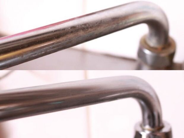 上が拭く前、下が拭いた後です。おお! こびりついていた水垢が落ちています!