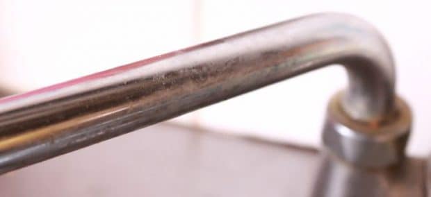 ご覧下さい。この水垢。蛇口は本当に毎日拭いていても汚れてしまいがちですね。ここにもウタマロクリーナーを噴射し、5分ほど置きます。