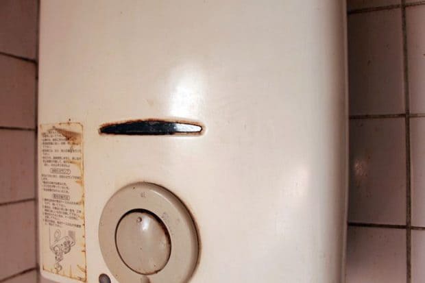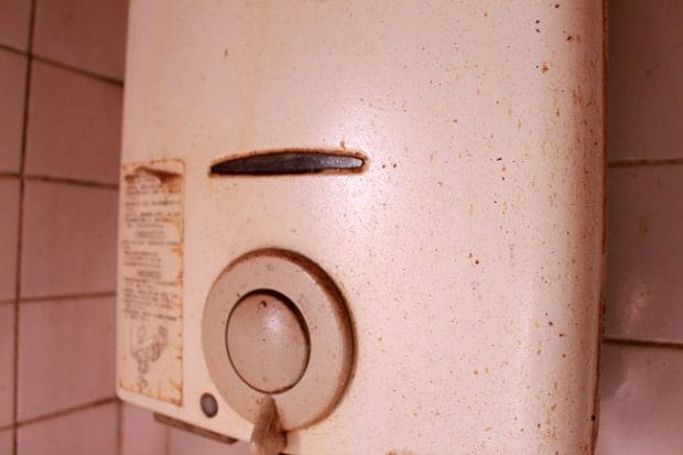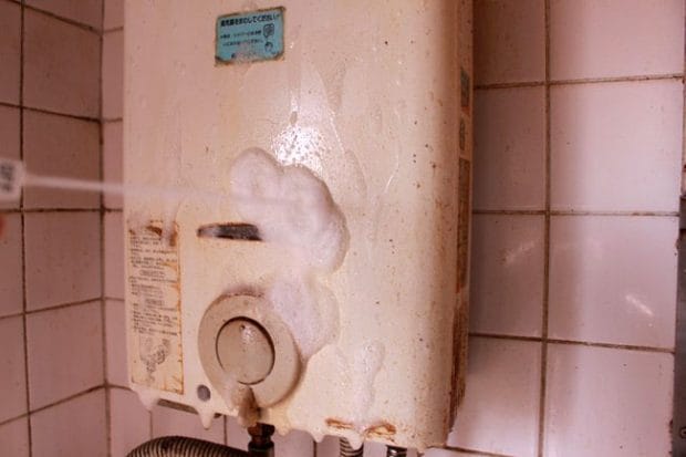 筆者の家のガス給湯器です。油が飛び散り、非常に汚くなっています。お見苦しいものを見せて申し訳ありません……。