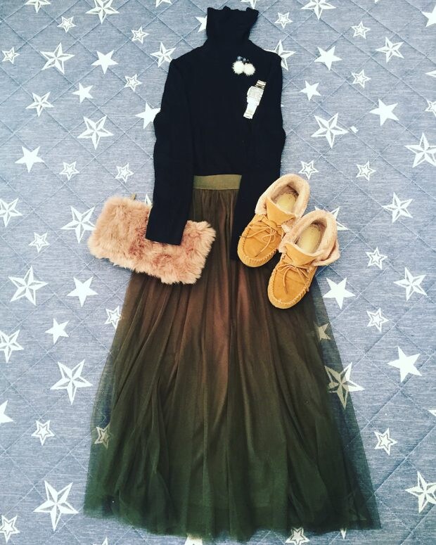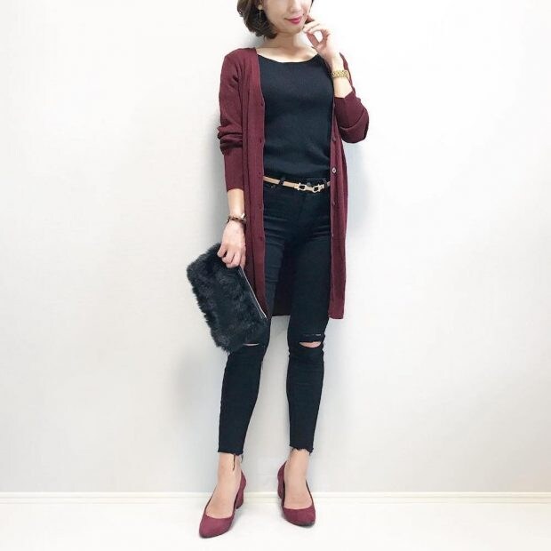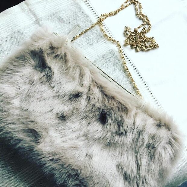 シンプルなコーディネートに、クラッチバッグがアクセントになっています。大人っぽいコーディネートの中のファーが、あか抜けた着こなしを演出。