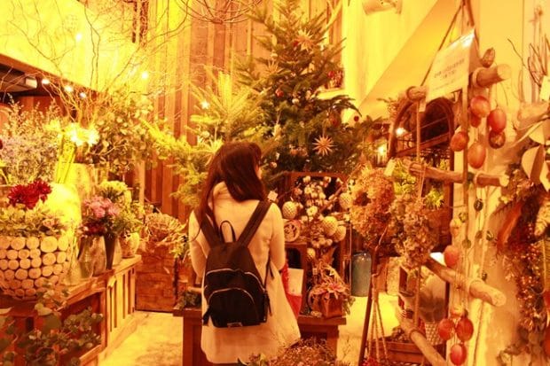 1階の花屋さんは、リースやドライフラワーが飾られ、クリスマス気分が盛り上がります。