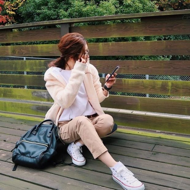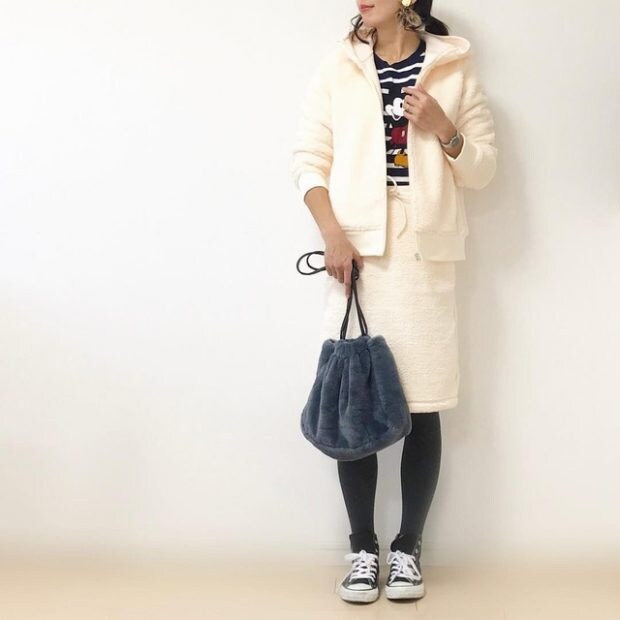 同素材のスカートもあるので、セットアップにして着こなすことも可能。ふわもこバッグを持ってとことん大人かわいくキメてみて。合わせるカラーをダークカラーでまとめるとスイートな印象になりません!!