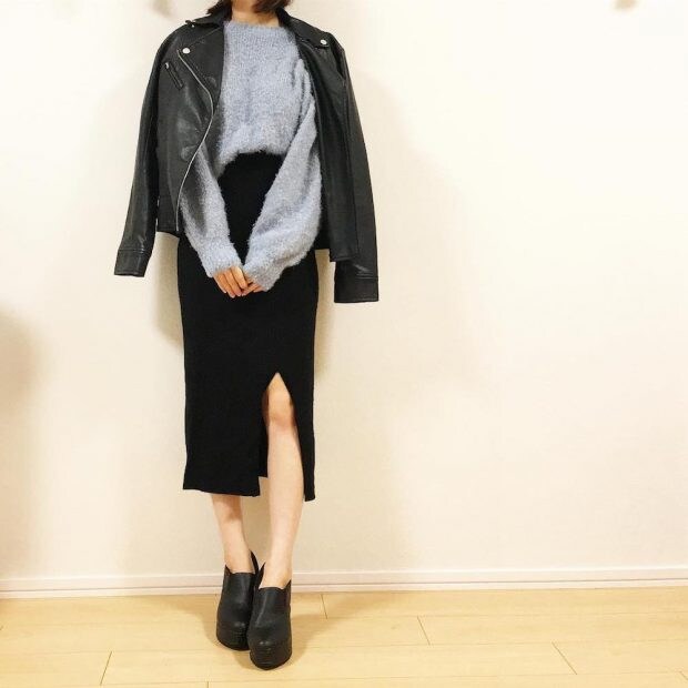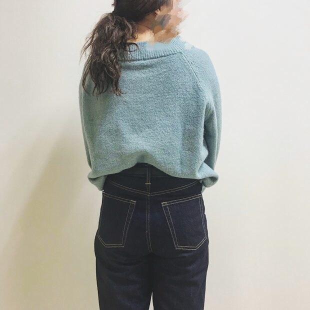 ブルー×ブラックで、グッと引き締まった大人っぽいコーデが素敵。くすんだ色合いがキレイに映えていますね。こちらは、フェザーヤーンセーター。990円とはまったく思えません……!