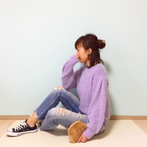 こちらはオフショルダーセーター。ブルーとは一転、ラベンダーはホワイトや薄い色合いのデニムアイテムと組み合わせるのがオススメ。淡いトーンのコーディネートで、周りと差をつけてみるのはいかが?