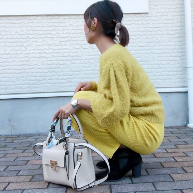 冬のイエローといえば定番はマスタードですが、パステルカラーのイエローも素敵! こちらのコーディネートは、スカートも同じイエローで合わせ、セットアップ風に着こなしています。これは真似したくなっちゃいますね!