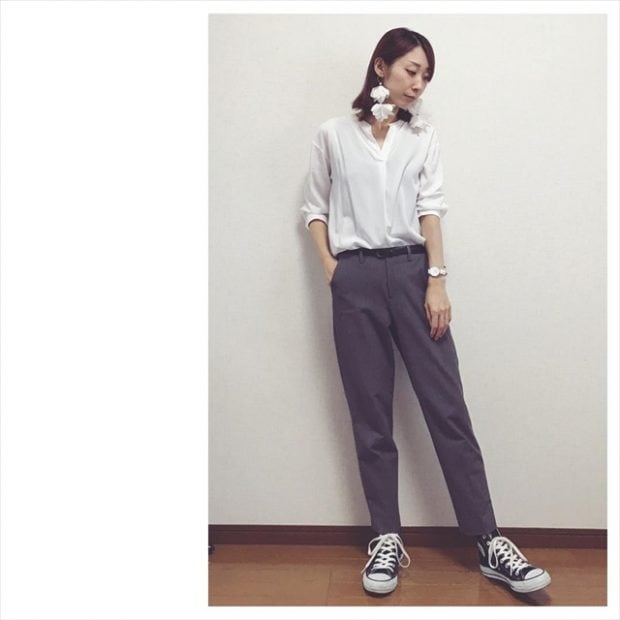 主役級ピアスはシンプルな洋服と合わせて、コーデのアクセントにするのがポイント! こちらもモノトーンでマニッシュな印象のコーデを、おしゃれで女性らしく仕上げてくれています。