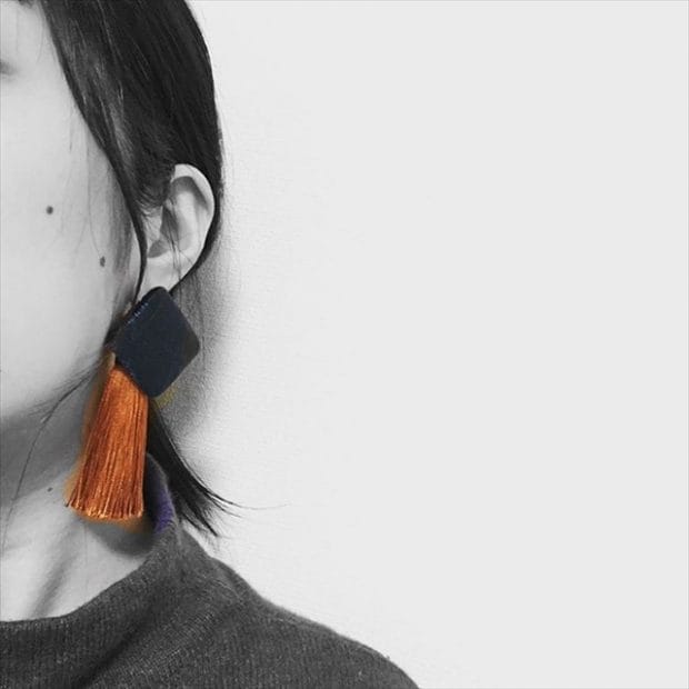 ピアスは季節感を出したいときにも便利なアイテム。落ち着いたトーンのスクエアパーツと、くすみオレンジのタッセルとの組み合わせで、コーデが一気に秋冬っぽくなります。