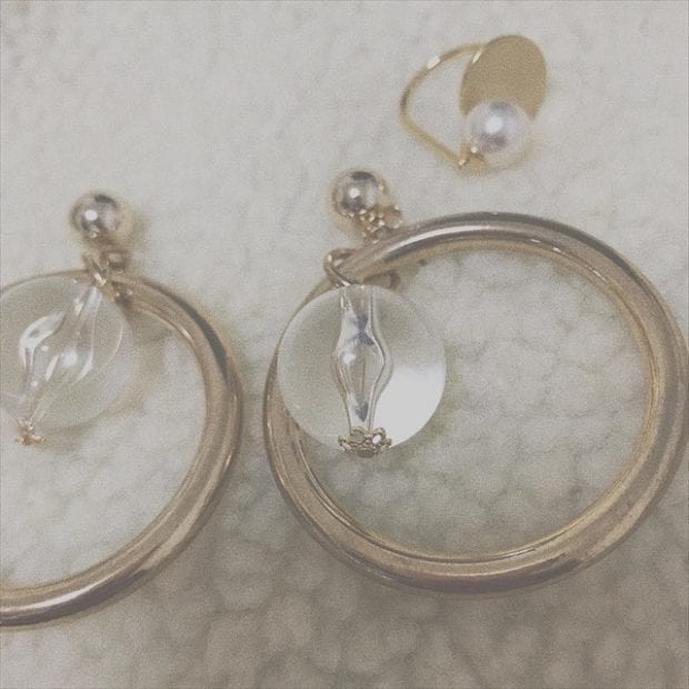 大玉のアクリルビーズがかわいい、シンプルなフープピアス。きれいめでもカジュアルでもOKなコーデを選ばない万能デザインなので、「コーデが何か物足りない……」なんてときにも大活躍ですよ!