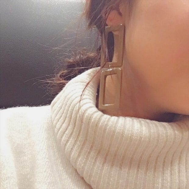 こっくりカラーがかわいい、幾何学模様のピアス。シンプルなニットと合わせると、コーデがちょっぴりモードっぽくおしゃれな雰囲気に!