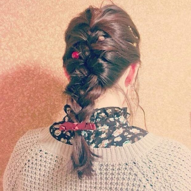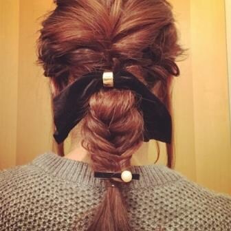 バックで三つ編みをしただけの簡単アレンジにもファーヘアゴムが活躍! グレーのファーならどんな服にも合わせやすいですね!