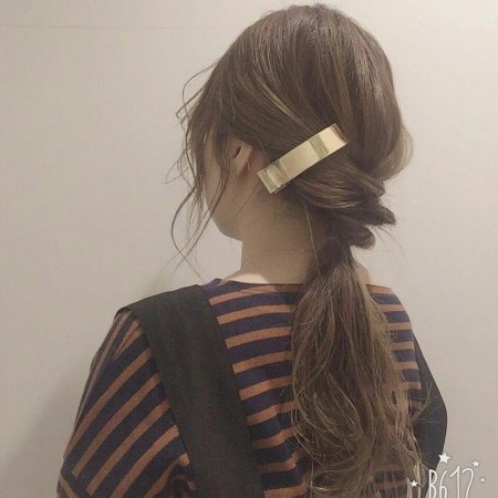 2回くるりんぱしただけのスタイルにゴールドのクリップをつければ、手の込んだ高見えアレンジに!