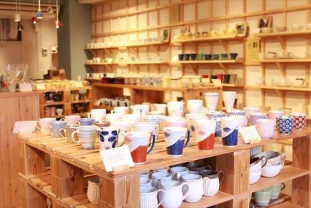 様々な色や形のマグカップが、壁際にまでずらっと並んでいます。その数、なんと400種類以上。伝統的な窯元の器から、気鋭の新進作家のモダンな器まで、1,500円~1万円ほどの価格帯で揃っています。