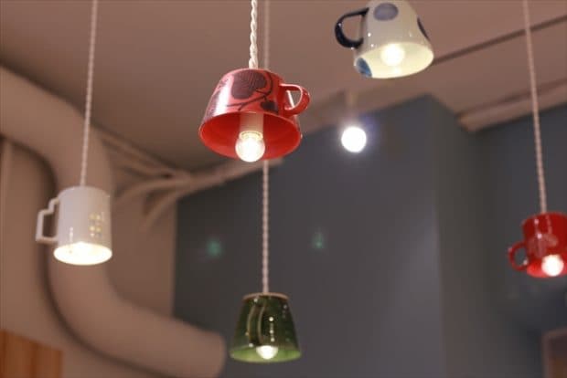 天井から吊り下げられている照明のカバーをよく見ると、なんと色とりどりのマグカップ! オシャレで粋なインテリアが素敵です。