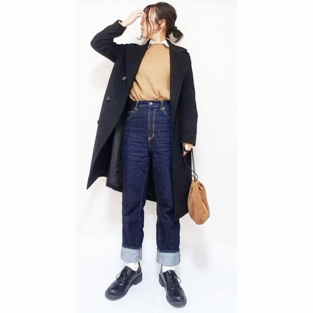 バランスを取るのが難しいロングコートも、ハイウエストデニムならすっきりキマります。ロールアップは太めにするのが、公式おすすめの着こなし術!